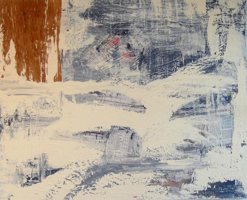 Acryl, Kozo Rinde, Zeitungsblätter (knapp sichtbar Roger Federer ...) 100 x 80 cm Preis: CHF 2200.-